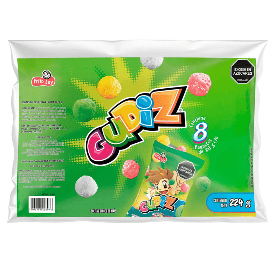Pasabocas Gudiz delivers a delicious assortment of crispy and flavorful snacks, perfect for satisfying your cravings or sharing with friends and family. Each pack contains 8 individual servings, totaling 224g, offering the perfect combination of taste and convenience. These Colombian snacks are ideal for parties, lunchboxes, or as an anytime treat.