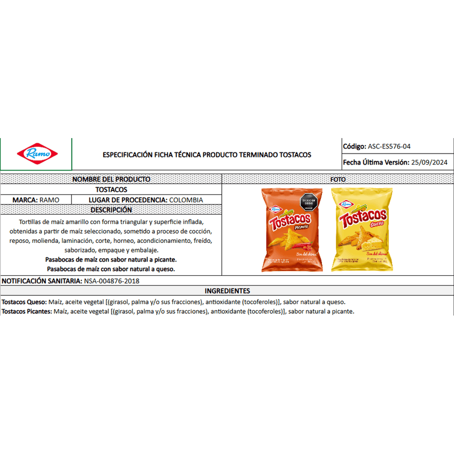 Tostacos Sabor a Picante by Ramo offers a crunchy, spicy snack packed with bold flavor. Each bag, weighing 25g, delivers the perfect balance of crispy texture and a zesty kick of spice. This 12-pack is ideal for sharing at gatherings, enjoying on the go, or satisfying your spicy snack cravings. A Colombian favorite, Tostacos are perfect for those who love bold and savory flavors.